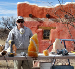 Back around the the year 2000, I attended the Tucson Gem and Mineral Show where I came across this beautiful stone and immediately had an idea to use a slab of Honeycomb Calcite in a small adobe building I was constructing at that time in southern Arizona. Once I had incorporated the stone into the building’s adobe wall and saw the captivating stained glass effect of this translucent stone, I wanted to get involved working-with and selling Honeycomb Calcite. I contacted and established a business relationship with owners of the calcite quarry and Desert Homestead Stone Products was establish. Since that time, my wife Peggy and I enjoy meeting people curious and excited to have this beautiful stone in their homes; and to see artisans crafting products from their imagination.Background: I am an aerospace engineer, natural (earthen) builder, digital filmmaker, solar power enthusiast, and stone-crafter living in Phoenix and Arivaca, here in Arizona.Feel welcome to contact me the discuss possibilities..... Bart